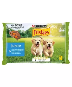 Dane produktowe Friskies Junior Karma dla szczeniąt w sosie z kurczakiem i marchewką 400 g (4 x 100 g) Pełnoporcjowa karma dla szczeniąt. Bez barwników, bez dodatku sztucznych aromatów i konserwantów. Składniki: mięso i produkty pochodzenia zwierzęcego (w tym kurczak 4 %), zboża, ryby...