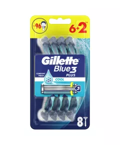 Dane produktowe Gillette Blue3 Plus Cool, maszynki jednorazowe dla mężczyzn, 8 sztuk Gillette Blue3 to najczęściej kupowana na świecie maszynka jednorazowa z 3 ostrzami. Te maszynki do golenia dla mężczyzn wyposażone są w ostrza dopasowujące się do konturu twarzy oraz w technologię ComfortGel...