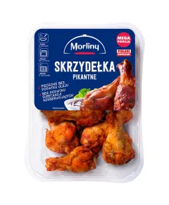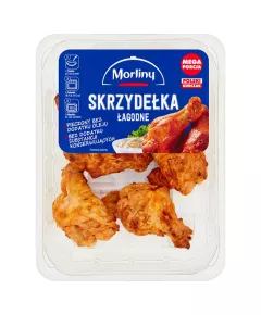Dane produktowe Morliny Skrzydełka łagodne 350 g Składniki: skrzydła kurczęce, przyprawy, sól, mąka ryżowa, ekstrakty drożdżowe, warzywa suszone (cebula, czosnek, natka pietruszki), cukier, ekstrakty przypraw (w tym ekstrakt z papryki), stabilizatory: octany potasu, mleczan potasu,...