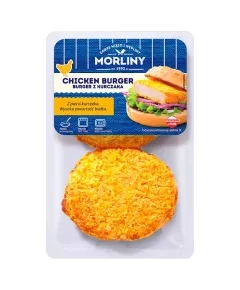 Dane produktowe Morliny Burger z kurczaka 400 g Składniki: mięso z fileta z piersi kurczaka (54 %), woda, MĄKA PSZENNA, płatki kukurydziane, sól, błonnik grochowy, skrobia ziemniaczana, drożdże, olej rzepakowy, przyprawy, ekstrakty przypraw, skrobia modyfikowana, substancje...