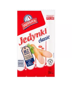 Dane produktowe Indykpol Parówki Jedynki classic 200 g Składniki: mięso z indyka 81%, woda, tłuszcz indyczy, sól, skrobia ziemniaczana, przyprawy, ekstrakty przypraw (w tym: SELER), aromaty, przeciwutleniacz: izoaskorbinian sodu, substancja konserwująca: azotyn sodu Dodatki: Nie...
