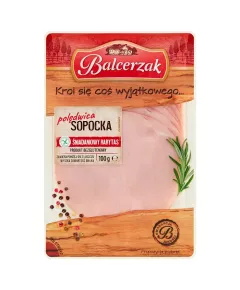 Dane produktowe Balcerzak Polędwica sopocka 100 g Składniki: mięso wieprzowe (80%), woda, sól, stabilizatory: E326, E261, E451, glukoza, błonnik PSZENNY bezglutenowy, substancja zagęszczająca: E407a, białko wieprzowe, przeciwutleniacz: E316, aromat, substancja konserwująca: E250...