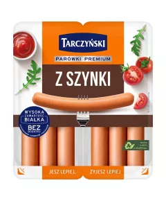 Dane produktowe Tarczyński Parówki premium z szynki 220 g (2 x 110 g) Polska Rodzinna Firma Składniki: mięso z szynki wieprzowej 95 %, skrobia, sól, przyprawy, ekstrakty przypraw, aromaty (w tym aromat dymu wędzarniczego), cukier, białko wieprzowe, przeciwutleniacz: askorbinian sodu,...