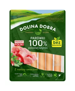 Dane produktowe Dolina Dobra Parówki 100 % polskiej szynki 200 g Składniki: mięso wieprzowe z szynki (100 g produktu otrzymano ze 100 g mięsa wieprzowego z szynki), sól, glukoza, przyprawy, ekstrakty owoców, warzyw i przypraw, aromaty Dodatki Nie zawiera: konserwanty Marka...
