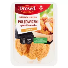 Dane produktowe Drosed Polędwiczki z piersi kurczaka łagodne 250 g Składniki: polędwiczka z piersi kurczaka 80%, mąka PSZENNA, skrobia modyfikowana, skrobie: PSZENNA, ryżowa, olej rzepakowy, gluten PSZENNY, sól, substancje spulchniające: E450, E500, ekstrakty przypraw, oregano suszone,...