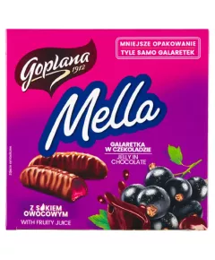 Dane produktowe Goplana Mella Galaretka w czekoladzie o smaku czarnej porzeczki 190 g Składniki: cukier, syrop glukozowy, czekolada 19% (cukier, miazga kakaowa, tłuszcz kakaowy, tłuszcze roślinne (palmowy, shea) w zmiennych proporcjach, kakao w proszku o obniżonej zawartości...