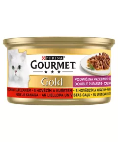 Dane produktowe Gourmet Gold Karma dla kotów podwójna przyjemność wołowina i kurczak 85 g Pełnoporcjowa karma dla dorosłych kotów. Składniki: mięso i produkty pochodzenia zwierzęcego (20 %, w tym wołowina 4 % i kurczak 4 %), roślinne ekstrakty białkowe, zboża, ryby i produkty rybne,...