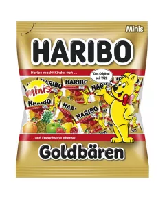 Dane produktowe Haribo Goldbären Minis Żelki owocowe 250 g Składniki: syrop glukozowy, cukier, żelatyna, dekstroza, soki owocowe z zagęszczonego soku: jabłko, truskawka, malina, pomarańcza, cytryna, ananas, kwas: kwas cytrynowy, koncentraty owocowe i roślinne: krokosz, spirulina,...