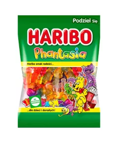 Dane produktowe Haribo Phantasia Żelko-pianki o smaku owocowym i o smaku cola 160g Kształt: mix żelków w różnych kształtach m.in. dżdżownic, zwierząt, butelek coli, samolotów Barwa: czerwona, biała, żółta, zielona, pomarańczowa, brązowa, niebieska, różowa Zapach: charakterystyczny dla...