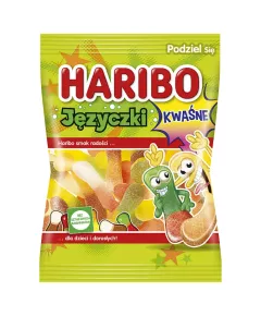 Dane produktowe Haribo Języczki Żelki o smaku owocowym kwaśne 85 g Składniki: syrop glukozowy, cukier, skrobia, kwasy: kwas jabłkowy, kwas cytrynowy, substancja żelująca: gellan, regulator kwasowości: cytrynian trisodowy, cytrynian trójwapniowy, wodorojabłczan sodu, aromat, koncentraty...
