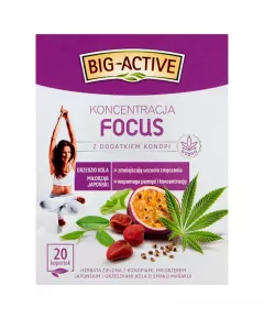 Dane produktowe Big-Active Focus Herbata zielona koncentracja 30 g (20 x 1,5 g) Herbata Koncentracja Focus jest szczególnie polecana osobom, które w okresie wzmożonej aktywności umysłu odczuwają obniżenie zdolności koncentracji i zmniejszenie sprawności umysłowej. Zawarty w herbacie miłorząb...