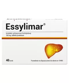 Dane produktowe Essylimar 100 mg Tabletki powlekane 40 sztuk Produkt leczniczy wydawany bez recepty - OTC. Składniki: 1 tabletka zawiera: 100 mg kompleksu sylimarynowo-fosfolipidowego o zawartości 30 % flawonolignanów w przeliczeniu na sylibinę i 1,5 % fosforu Dodatki Marka...