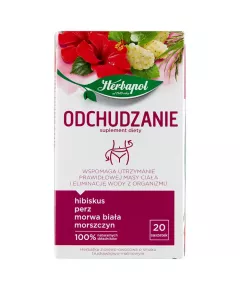 Dane produktowe Herbapol Odchudzanie Suplement diety herbatka ziołowo-owocowa 40 g (20 x 2 g) Kwiat hibiskusa wspomaga usuwanie nagromadzonej w organizmie wody. Kłącze perzu wspomaga eliminację wody z organizmu oraz wpływa korzystnie na utrzymanie prawidłowej masy ciała. Liście morwy białej...