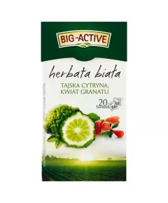 Dane produktowe Big-Active Herbata biała tajska cytryna kwiat granatu 30 g (20 x 1,5 g) Intrygująca mieszanka, łącząca w sobie subtelność białej herbaty i orzeźwiającą moc tajskiej cytryny. Wzbogacona czerwienią płatków kwiatu granatu tworzy niezwykle barwną i niezapomnianą w smaku...