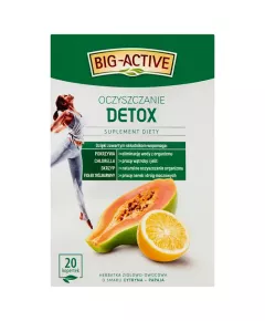 Dane produktowe Big-Active Detox oczyszczanie Suplement diety herbatka ziołowo-owocowa 40 g (20 x 2 g) Dzięki zawartym składnikom wspomaga: Pokrzywa - eliminację wody z organizmu Chlorella - pracę wątroby i jelit Skrzyp - naturalne oczyszczanie organizmu Fiołek trójbarwny - pracę nerek i dróg...