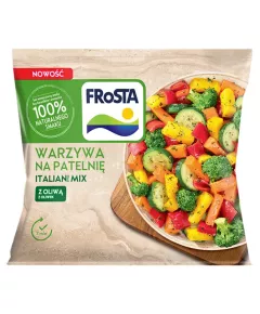 Dane produktowe FRoSTA Warzywa na patelnię z oliwą z oliwek 400 g Składniki: warzywa 94 % (cukinia, marchew, brokuł, marchew żółta [słodka i chrupiąca], papryka czerwona), woda, sól (bez substancji przeciwzbrylających), oliwa z oliwek 0,5 % (extra virgin), czosnek (ząbki krojone i...