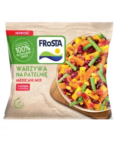 Dane produktowe Frosta Warzywa na patelnię z sosem z pomidorami 400 g Składniki: warzywa 94 % (marchew, pomidory 19 %, marchew żółta [słodka i chrupiąca], fasola szparagowa, fasola czerwona gotowana (woda, fasola czerwona, sól), papryka żółta, kukurydza), sos 6 % (woda, sól [sól bez...