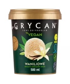 Dane produktowe Grycan Vegan Lody waniliowe 500 ml Niska zawartość cukrów. Zawierają substancje słodzące i naturalnie występujące cukry. Odpowiedni dla wegan i wegetarian. Składniki: napoje roślinne [napój kokosowy (ekstrakt z kokosa - 70%, woda), napój ryżowy (woda, ryż - 17%, olej...