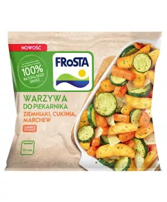 Dane produktowe FRoSTA Warzywa do piekarnika ziemniaki cukinia marchew 400 g Składniki: warzywa 74 % (marchew 35 %, cukinia 22 %, cebula), smażone ziemniaki 22 % (w formie łódeczek, idealne do zapiekania) (ziemniaki, zawiera olej słonecznikowy i/lub olej rzepakowy, dekstroza, sól),...