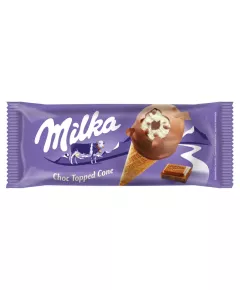 Dane produktowe Milka Lody o smaku waniliowym z kawałkami mlecznej czekolady w rożku waflowym 110 ml Składniki: MLEKO odtłuszczone (odtworzone), cukier, mleczna czekolada (z alpejskiego mleka) (cukier, tłuszcz kakaowy, miazga kakaowa, MLEKO w proszku odtłuszczone z Alp 1%, tłuszcz...