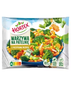 Dane produktowe Hortex Warzywa na patelnię z bazylią i tymiankiem 450 g Składniki: warzywa 99 % w zmiennych proporcjach: marchew, cukinia, fasola szparagowa płaskostrąkowa, papryka, 1 % przyprawy w saszetce (w zmiennych proporcjach: sól, bazylia, tymianek, czosnek, kolendra, cebula,...