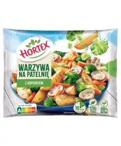 Dane produktowe Hortex Warzywa na patelnię z koperkiem 450 g Składniki: warzywa 85 % w zmiennych proporcjach: ziemniaki podsmażane ze skórką (ziemniaki, olej słonecznikowy (S) i/lub olej rzepakowy (R)), brokuły, marchew, cebula, koper 3 %, pieczarki 15 %, Symbol użytego oleju (S, R) w...
