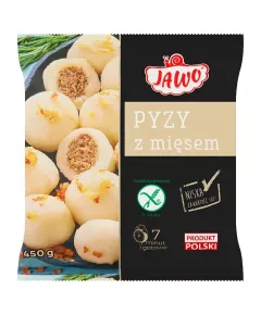 Dane produktowe Jawo Pyzy z mięsem 450 g Składniki: woda, grysik ziemniaczany 18 %, skrobia ziemniaczana, mięso wieprzowe 9 %, mięso wołowe 4,6 %, białko SOJOWE, cebula, przyprawy (zawierają GORCZYCĘ), olej rzepakowy, sól, błonnik PSZENNY bezglutenowy, suszone warzywa (marchew,...