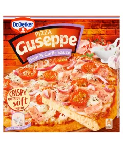 Dane produktowe Dr. Oetker Guseppe Pizza z szynką i sosem czosnkowym 440 g Składniki: mąka PSZENNA, woda, 9,3 % SER (MOZZARELLA, EDAMSKI), 7,0 % szynka (mięso wieprzowe, woda, skrobia modyfikowana, białko SOJOWE, sól, glukoza, cukier, stabilizatory (polifosforany, trifosforany, azotyn...