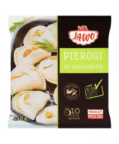 Dane produktowe Jawo Pierogi ze szpinakiem 450 g Uwaga! Produkt jest wykonany ręcznie i może się nieznacznie różnić wielkością i kształtem. Składniki: mąka PSZENNA, szpinak 28 %, woda, SER twarogowy 12 %, błonnik PSZENNY bezglutenowy, olej rzepakowy, przyprawy, sól, suszone warzywa...