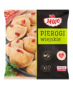 Dane produktowe JAWO Pierogi wiejskie 450 g Składniki: mąka PSZENNA, ziemniaki 30 %, woda, boczek wędzony surowy 7 % (mięso wieprzowe 97 %, ekstrakty przypraw, aromaty), cebula, olej rzepakowy, sól, przyprawy Dodatki Marka JAWO Dodatkowe informacje wielka orkiestra...