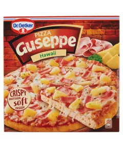 Dane produktowe Dr. Oetker Guseppe Pizza z szynką i ananasem 415 g Składniki: mąka PSZENNA, woda, 10 % marynowane kawałki ananasa (kawałki ananasa, woda, cukier, regulator kwasowości (kwas cytrynowy)), 10 % SER (MOZZARELLA, EDAMSKI), 6,9 % szynka (mięso wieprzowe, woda, skrobia...