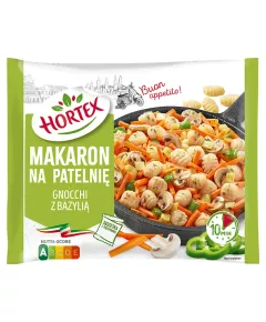 Dane produktowe Hortex Makaron na patelnię gnocchi z bazylią 450 g Składniki: warzywa 44 % w zmiennych proporcjach: marchew, cebula, papryka, gnocchi ziemniaczane 30 % (woda, płatki ziemniaczane 17,8 %, skrobia ziemniaczana, mąka z PSZENICY durum, olej rzepakowy, sól, barwnik:...