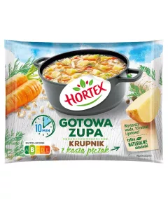 Dane produktowe Hortex Gotowa zupa krupnik z kaszą pęczak 450 g Składniki: warzywa 71 % w zmiennych proporcjach: ziemniaki, marchew, cebula, pietruszka, gotowana kasza pęczak 27 % (woda, kasza pęczak JĘCZMIENNA), przyprawa w saszetce 2 % (ziele angielskie, pieprz czarny, liście...