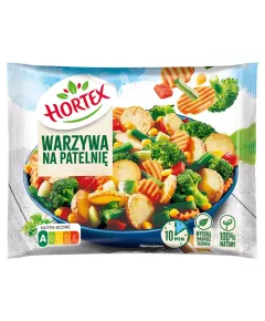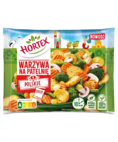 Dane produktowe Hortex Warzywa na patelnię polskie 450 g Składniki: warzywa 84 % w zmiennych proporcjach: ziemniaki podsmażane (ziemniaki, olej słonecznikowy (S) i/lub olej rzepakowy (R)), brokuły, marchew, fasola szparagowa, cebula, pieczarki 15 %, przyprawa w saszetce 1 % (sól,...