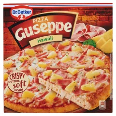 Dane produktowe Dr. Oetker Guseppe Pizza z szynką i ananasem 415 g Składniki: mąka PSZENNA, woda, 10 % marynowane kawałki ananasa (kawałki ananasa, woda, cukier, regulator kwasowości (kwas cytrynowy)), 10 % SER (MOZZARELLA, EDAMSKI), 6,9 % szynka (mięso wieprzowe, woda, skrobia...