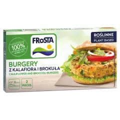 Dane produktowe FRoSTA Burgery z kalafiora i brokuła 200 g (2 sztuki) Składniki: kalafior 20%, brokuły 20%, ziemniaki, mąka PSZENNA, mąka z PSZENICY durum, gotowana brązowa soczewica 6% (woda, soczewica), olej słonecznikowy, cebula, pietruszka 2%, czerwona papryka, woda, skrobia...