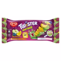 Dane produktowe Twister Monster Lody 70 ml Składniki: woda, cukier, przecier jabłkowy (7 %), syrop glukozowy, fruktoza, sok z cytryny z soku zagęszczonego (4 %), przecier jagodowy (2 %), błonnik rozpuszczalny, regulatory kwasowości (kwas winowy, kwas cytrynowy), stabilizatory (guma...
