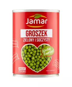 Dane produktowe Jamar Groszek 400 g Groszek konserwowy Jamar to wyselekcjonowane, pełne smaku ziarna, którym soczystości dodaje zalewa. Produkt wzbogaci smak wielu potraw, takich jak sałatki, wytrawne galaretki, pasty i dania na bazie jajek. Jesteśmy uznanym w Polsce i Europie producentem...