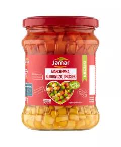 Dane produktowe Jamar Mieszanka warzywna marchewka kukurydza groszek 470 g Mieszanka marchewka – groszek – kukurydza Jamar to zestaw trzech pysznych i chrupkich warzyw. Mix warzywny nie tylko uprości proces przygotowywania dań obiadowych, sałatek i zapiekanek, ale także nada im wyjątkowy...