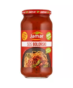 Dane produktowe Jamar Sos boloński 520 g Sos boloński Jamar to dodatek do dań rodem z Włoch, charakteryzujący się intensywnym smakiem pomidorów. Wzbogaci smak wielu potraw, szczególnie tych z makaronem, w tym klasycznego spaghetti bolognese. Jesteśmy uznanym w Polsce i Europie producentem...