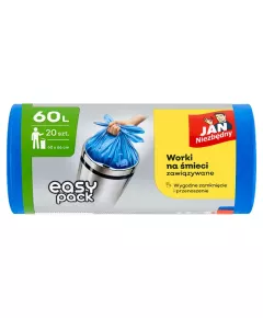 Dane produktowe Jan Niezbędny Easy-Pack Worki na śmieci 60 l 20 sztuk Worki posiadają specjalne "uszy", które można zawiązywać, co ułatwia przenoszenie worka i zapobiega wypadaniu śmieci, - są mocne i estetyczne, - wykonane z materiału HDPE w kolorze niebiesko-metalicznym, - posiadają biały...