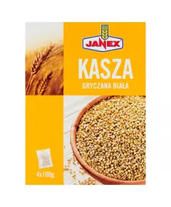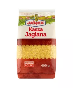 Dane produktowe Janex Kasza jaglana 400 g (4 x 100 g) Kasza jaglana jest produktem bogatym w składniki odżywcze takie jak skrobia działająca łagodząco na układ pokarmowy, wątrobę, drogi żółciowe oraz nerki. Zawiera białko i jest źródłem rzadko występującej w produktach spożywczych krzemionki...