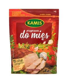 Dane produktowe Kamis Przyprawa do mięs Mieszanka przyprawowa 75 g Potrawy mięsne od lat królują na naszych stołach. Dlatego ich właściwe doprawianie to niezwykła sztuka. Nowa przyprawa do mięs Kamis została starannie skomponowana z 11 ziół i przypraw, aby zapewnić najlepszy smak mięsa. Za...