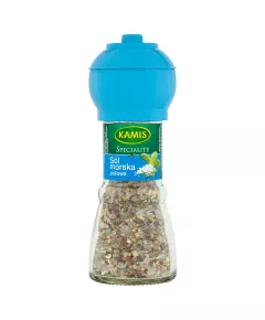 Dane produktowe Kamis Specialite Młynek Sól morska ziołowa 80 g Składniki: sól morska, GORCZYCA czarna i biała, cebula, papryka czerwona, pieprz czarny, zioła (bazylia, cząber) - 2% Dodatki Marka Kamis Dodatkowe informacje Przechowywanie Przechowywać w suchym i...