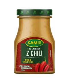 Dane produktowe Kamis Musztarda z chili 185 g Nada wyrazisty smak mięsom, burgerom, stekom i daniom z grilla, sprawdzi się jako składnik ostrych sosów. Odpowiednie dla wegan Składniki: woda, GORCZYCA, ocet spirytusowy, cukier, sól, koncentrat pomidorowy, chili cięte (1,5 %), ekstrakt z...