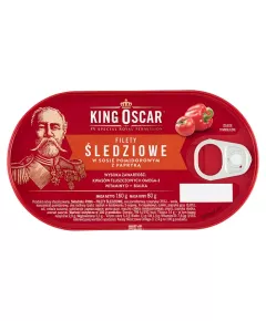 Dane produktowe King Oscar Filety śledziowe w sosie pomidorowym z papryką 160 g Składniki: RYBA - FILETY ŚLEDZIOWE, sos pomidorowy z papryką (35 %) - woda, koncentrat pomidorowy, olej roślinny (patrz nadruk w kodowaniu: S-sojowy, R-rzepakowy), cukier, papryka grys (0,8 %), sól, cebula...