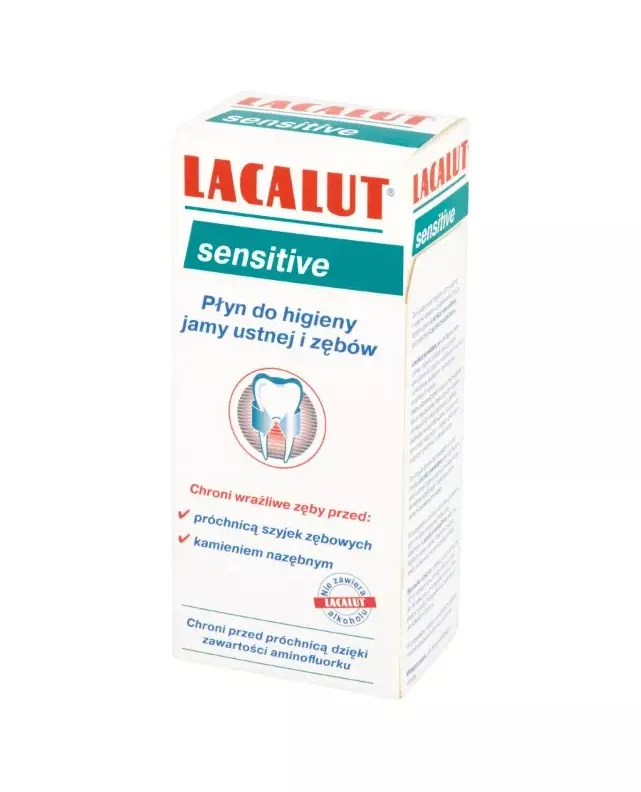 Odsłonięte szyjki zębów są szczególnie podatne na próchnicę. Dodatkowo narażone są na bodźce zewnętrzne, jak ciepło, zimno, kwaśny czy słodki smak, które w konsekwencji powodują ból. Dlatego seria LACALUT sensitive zalecana jest szczególnie dla osób odczuwających bolesną nadwrażliwość zębów. Płyn LACALUT sensitive nie zawiera alkoholu.