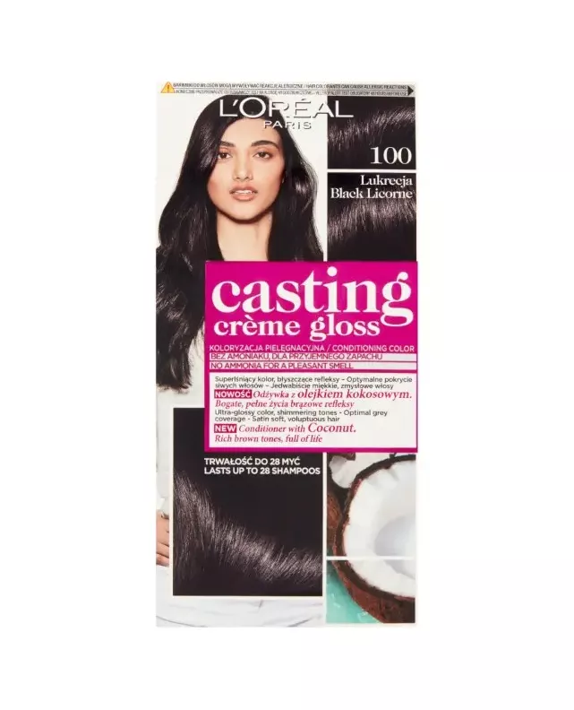 Krem koloryzujący do włosów L'Oréal Casting Créme Gloss zapewnia głęboki, mieniący się kolor pełen bogatych refleksów, przy zachowaniu naturalnego efektu farbowania. Kremowa formuła bez amoniaku zapewnia nawet do 100% pokrycia siwych włosów. Farba odtwarza naturalne bogactwo barw Twoich pasm przy zachowaniu mieniących się refleksów we włosach, a intensywny, głęboki kolor utrzymuje się aż do 28 myć, zapewniając brak efektu "odrostów". Zawartość kompleksu pielęgnującego w kremie koloryzującym pozwoli na wzmocnienie Twoich włosów zarówno od wewnątrz, jak i na ich powierzchni. Dzięki temu, pozostaną one delikatne i cudownie miękkie w dotyku. Nowa, ulepszona receptura odżywki Kuracja Lustrzany Blask, zainspirowana została brazylijskim rytuałem pielęgnacyjnym, który otula włos, pozwalając na niezwykłe wydobycie głębi koloru. Dzięki wzbogaceniu formuły o mleczko pszczele, Casting Creme Gloss zapewnia farbowanym włosom do 4x więcej blasku*, a także przedłuża trwałość barwników. Duże opakowanie pozwala zachować połysk koloru na dłużej! Farba jest łatwa w aplikacji, a formuła nieklejąca o przyjemnym, owocowym zapachu. Dzięki wygodnemu aplikatorowi, to doskonały produkt także dla początkujących. Pozwól, aby Twój kolor odżył na nowo przy pomocy kremu koloryzującego od L'Oréal Paris! (*test instrumentalny)