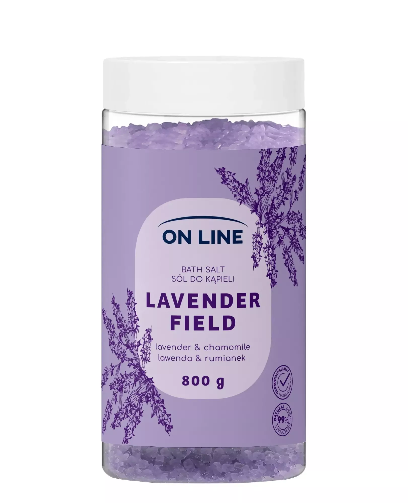 On Line Lavender Field sól do kąpieli wzbogacona ekstraktem z lawendy i rumianku oraz solą morską z Morza Martwego. Pielęgnuje i rewitalizuje Twoją skórę. Wyjątkowy zapach, który odpręża.