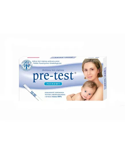 Domowy test ciążowy Pre-Test paskowy.Dokładność odpowiada testowi laboratoryjnemu i wynosi ponad 99%.Jest to jedyny test ciążowy polecany przez Polskie Towarzystwo Ginekologiczne.